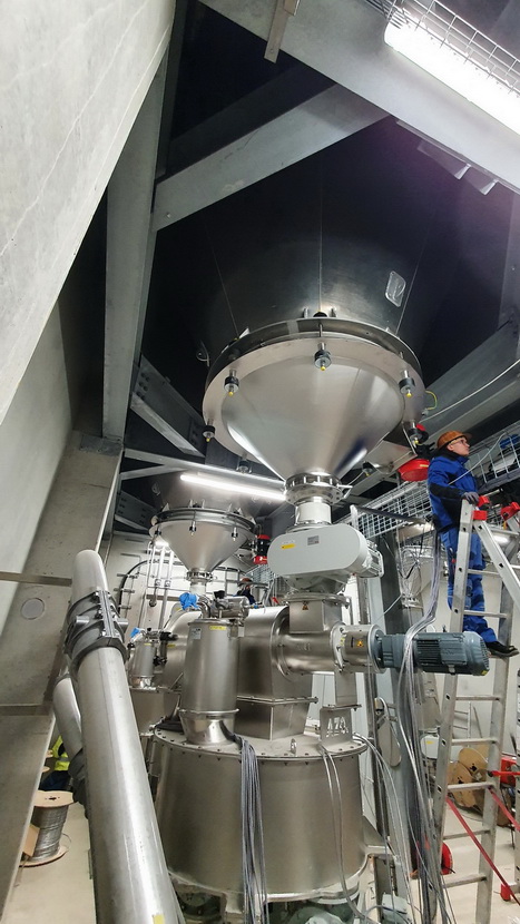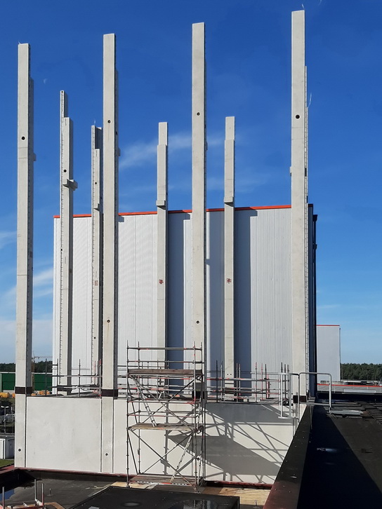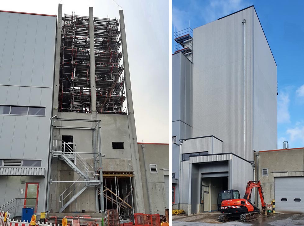 Aufgesetzte Stahlkonstruktion zur Aufnahme von 6 Silos mit 3-seitiger Umkleidung durch Stb.-Fertigteilwände zur brandschutztechnischen Abtrennung von den Bestandsbauten.