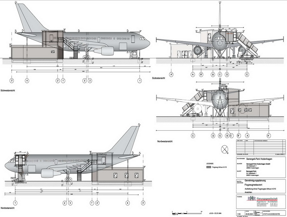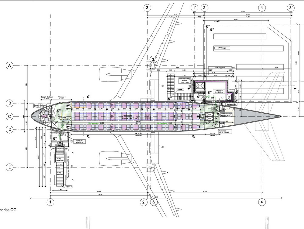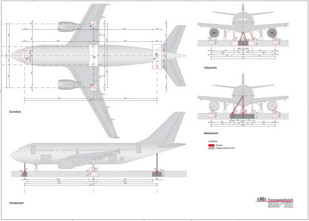 Statische Ausarbeitung einer Stahlkonstruktion zur Aufständerung unter Berücksichtigung geeigneter Lastpunkte an Flugzeugrumpf und Tragflächen, Genehmigungsplanungen für die Flugzeug-Gründung und -Aufständerung sowie Ausbau und Umnutzung zum Flugzeug-Restaurant.