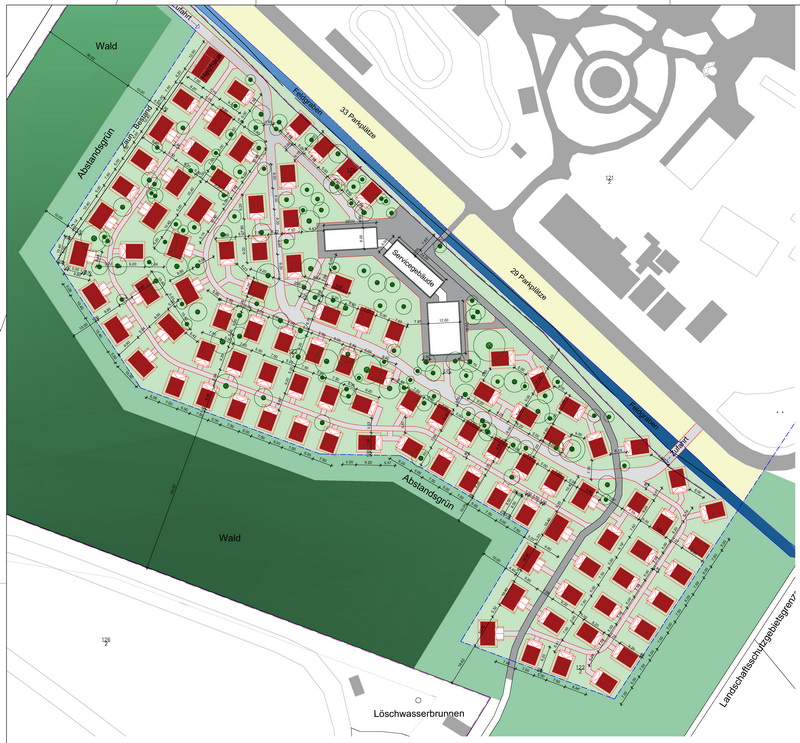 Konzeptionierung und Genehmigungsplanung zur Errichtung von 100 Zeltlodges für Übernachtungs-gäste, eines zentralen Service-Gebäudes und eines Heizhauses auf baumbestandenem Gelände,