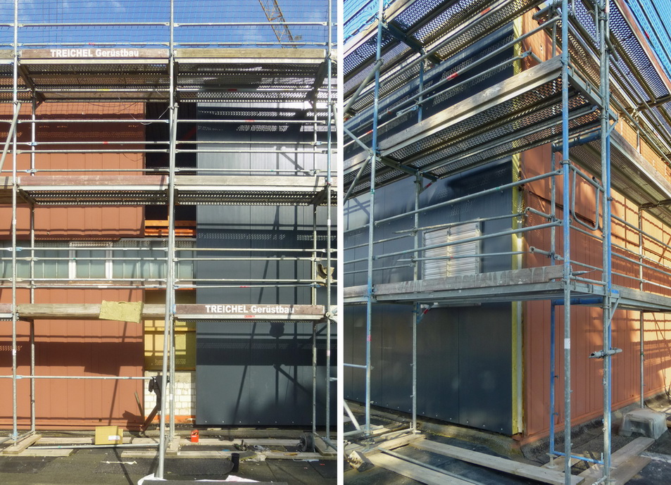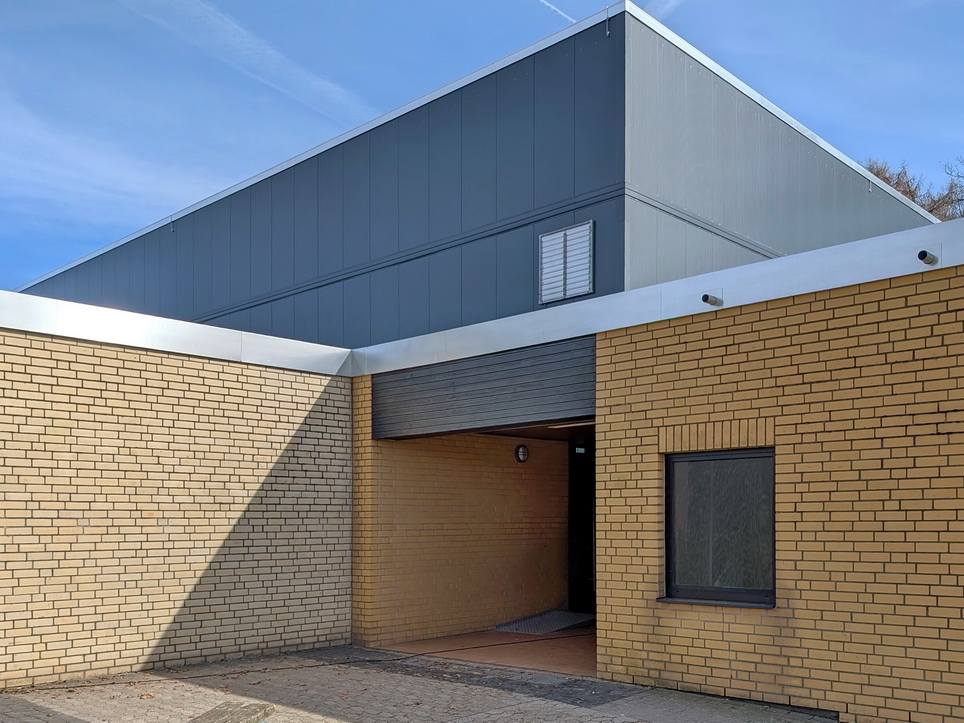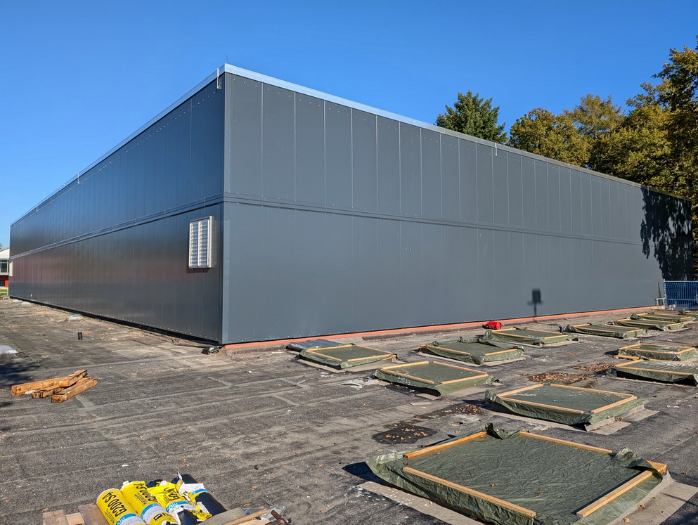 - Erneuerung der Hallenfassaden aus Stahl-Sandwichpaneelen mit verbessertem Brand- und Wärmeschutz – bei erschwerten Einbring- und Montagebedingungen durch angrenzende Wald-/Sportflächen und vollständige Hallenumbauung
