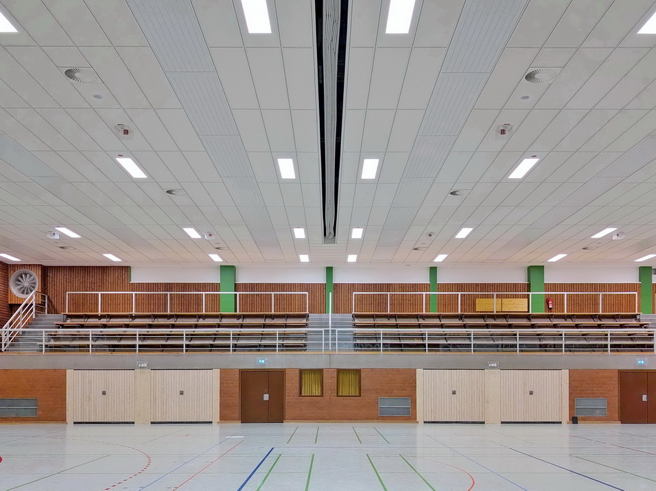 - Einbau einer ballwurfsicheren Sporthallen-Akustikdecke mit Heizflächen aus Deckenstrahlplatten und LED-Leuchten